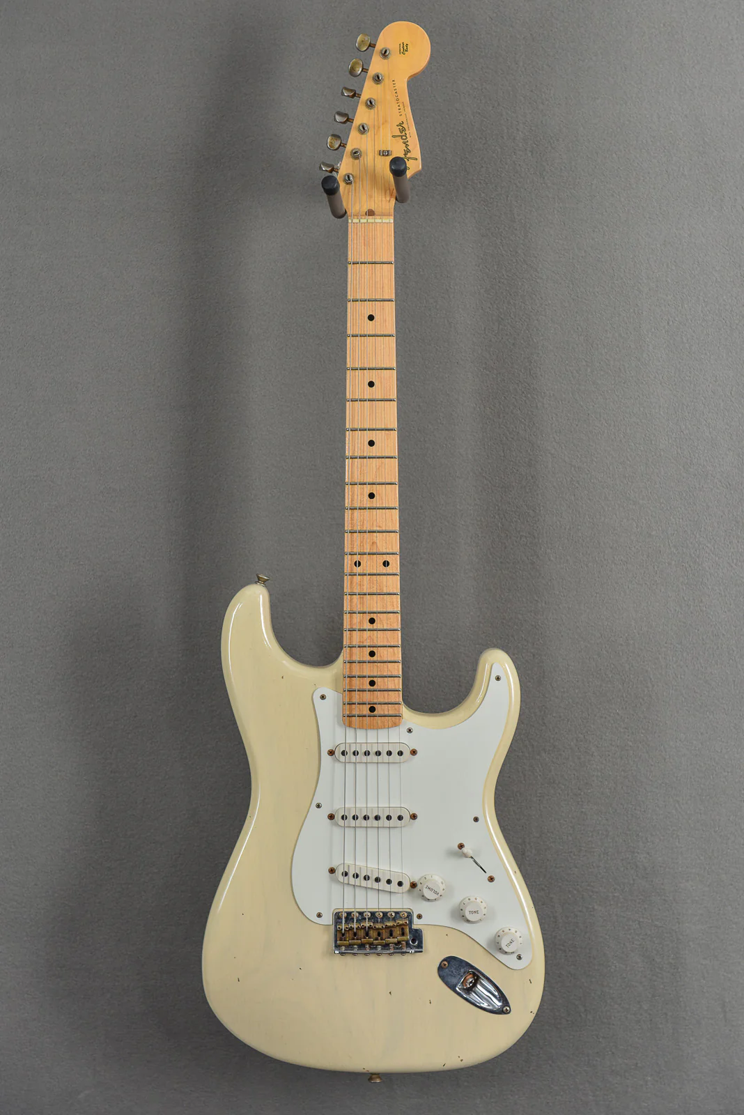 Vintage Blonde, Ash body, 10/56 V shaped Maple neck with a 9.5″ radius fingerboard and medium jumbo frets, 25.5″ scale length, 1.650” nut width, Handwound 1957 Relic Strat pickups, 5-way switching with the vintage mod #1 wiring, The neck thickness is .88″ at the first and .96″ at the 12th frets, 7.7 pounds, comes with Fender Custom Shop hardshell case.