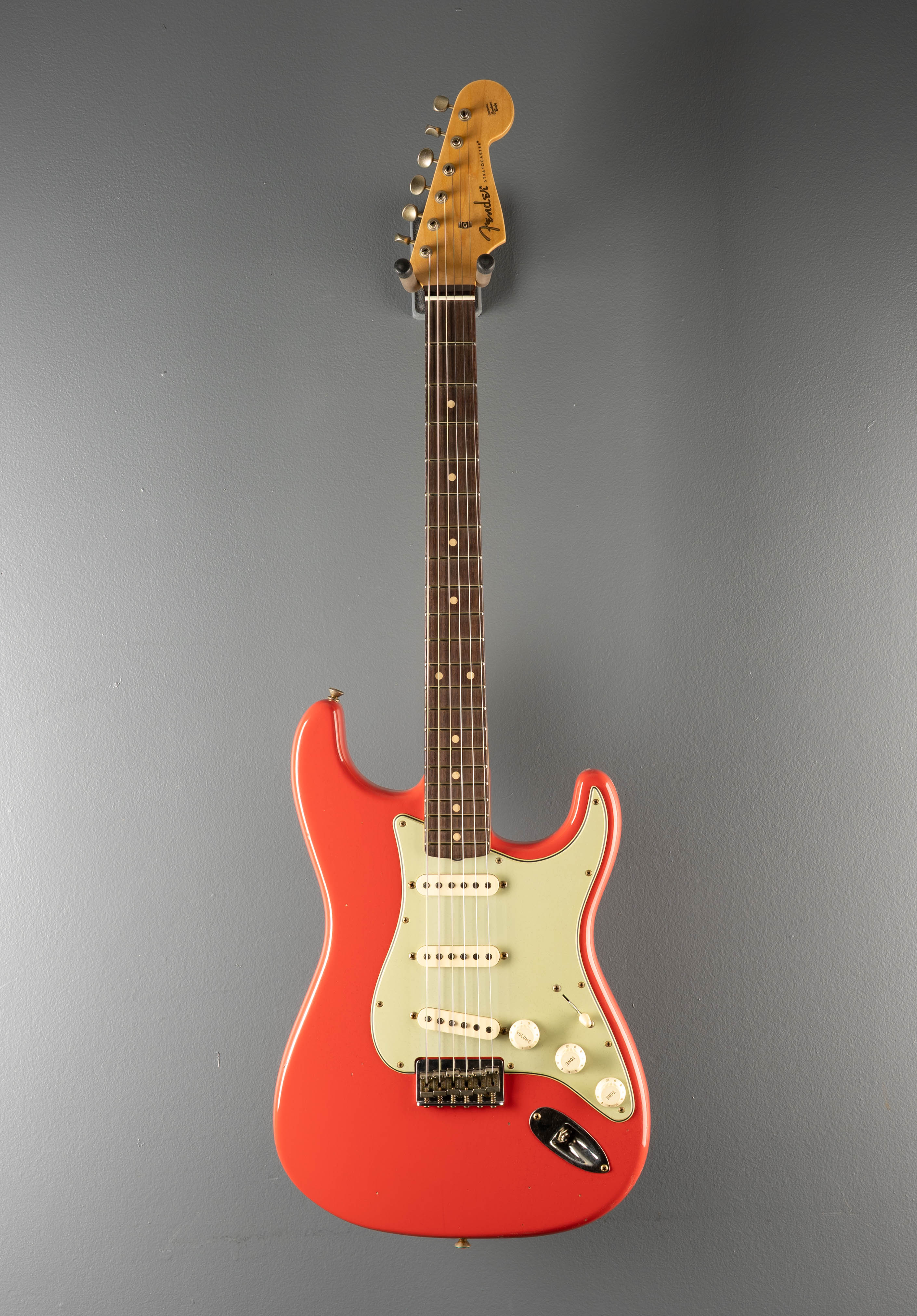 Fiesta Red, Aged nitrocellulose lacquer finish, Alder body, 60's oval C shaped Maple neck with a 9.5” radius AAA Rosewood fingerboard and medium jumbo frets, 25.5” scale length, 1.650” nut width, Handwound 60's Relic Strat neck/bridge with the RWRP Middle Pickups, 5-way switching with the volume/tone/tone controls and vintage Mod wiring #1, String thru body hardtail bridge with the bent steel saddles, Fender vintage style tuners, The neck thickness is .80" at the first and .94" at the 12th frets, 7.3 pounds, With Fender Custom Shop hardshell case