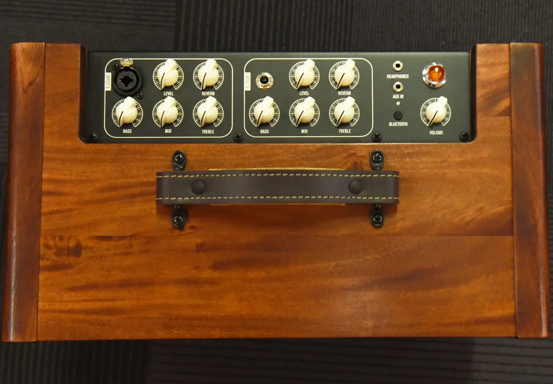 The idea was simple: Build a great-sounding acoustic guitar amp you can also sing through; make it compatible with a wide range of acoustic guitar pickups and playing environments; make it practical and easy to use, without over-engineering it with too many controls or effects; make the cabinet from an acoustic guitar tonewood to bring an extra warm, smooth sonic character to the amplified tone; give it the elegant aesthetic appeal of a finely crafted piece of furniture; and, finally, add Bluetooth connectivity to stream music and play or sing along.