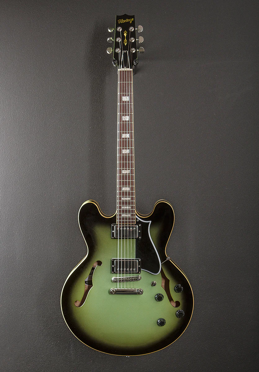 Green Burst, Vintage gloss nitrocellulose lacquer finish, Semi-hollow body with a solid center block, Laminated ultra figured Curly Maple top and back with the solid Curly Maple rim, Cream binding, 50's C shaped Mahogany neck, Bound 12” radius Rosewood fingerboard with the pearl block inlays and medium jumbo frets, 24.75” scale length, 1 11/16th" nut width, Heritage Custom Shop 225 Classic humbucking bridge and neck pickups, 3-way toggle switching with the volume and tone controls for each pickup, Locking tune-o-matic bridge and stop tailpiece, Heritage cast/sealed tuners, The neck thickness is .88″ at the first and .96″ at the 12th frets, 7.8 pounds, With the Heritage hardshell case, Excellent