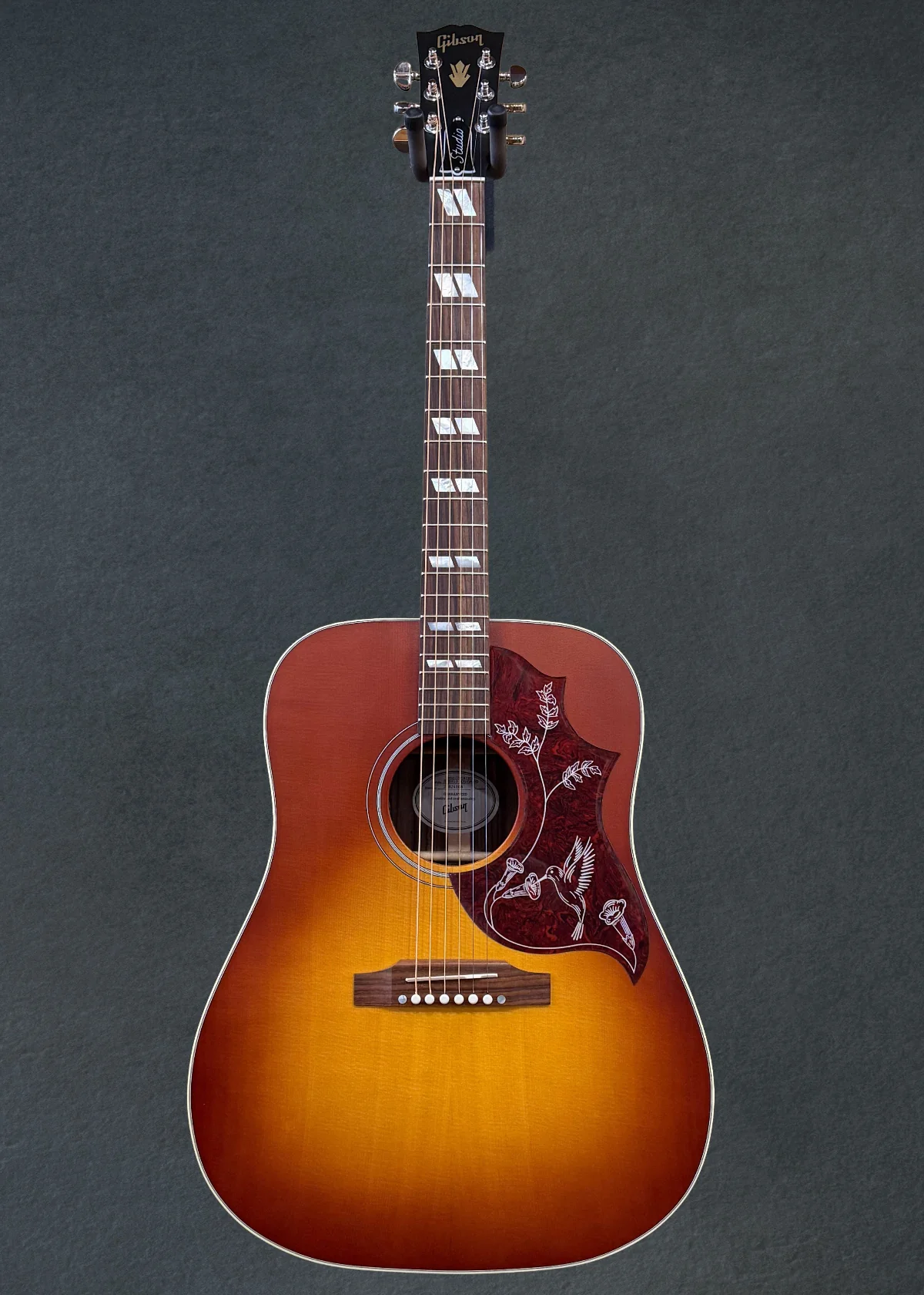 "The Hummingbird Studio continues Gibson’s long history of producing world-famous square shoulder body designs, such as the Hummingbird, Dove, and Songwriter models. We proudly introduce a slim body, Square Shoulder design, hand-built using all solid tonewoods. Available in both Satin Natural and Satin Rosewood Burst finishes, as well as lefty! Finished with a L.R. Baggs Element pickup for easy studio quality plug and play anywhere!"