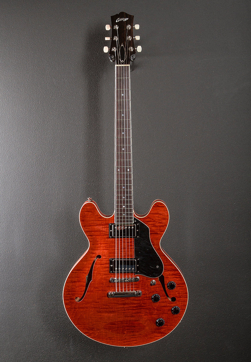 Faded Cherry, Serial number I35LC252549, High gloss nitrocellulose lacquer finish, Semi-hollow laminated Maple body with a Maple/Spruce center block, Non-grained Ivoroid binding, C shaped Honduran Mahogany neck, Bound 12" radius Rosewood fingerboard with the Mother of Pearl long dot inlays and medium frets, 24 7/8th" scale length, 1 11/16th" nut width, Lollar Low Wind Imperial humbucking bridge and neck pickups with the 50's style wiring, Kluson ABR-1 tune-o-matic bridge and stop tailpiece, Gotoh/Collings tuners, 7.4 pounds, With the Ameritage hardshell case