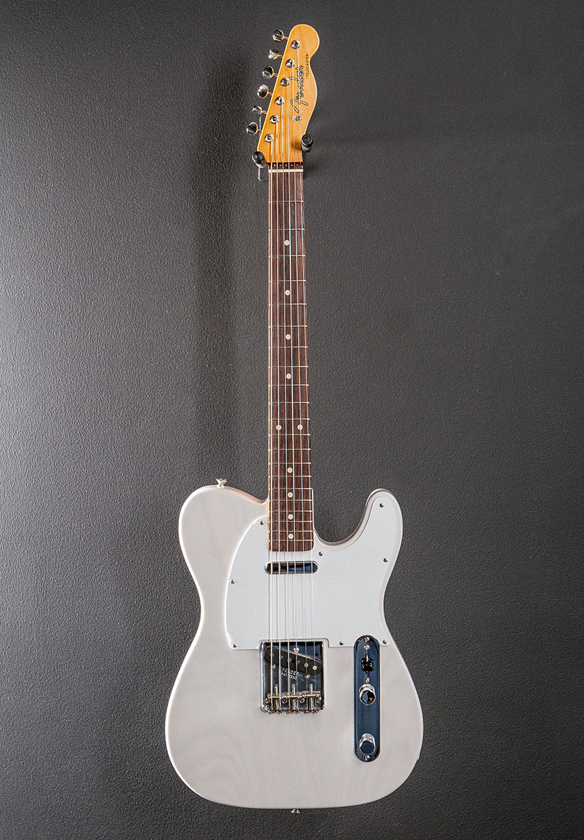 White Blonde, Gloss lacquer body finish, Two piece Ash body, Jimmy Page custom Oval C shaped Maple neck with a 7.25” radius Rosewood fingerboard and vintage size frets, 25.5" scale length, 1.650" nut width, Jimmy Page custom '59 Tele bridge and neck pickups, 3-way switching with the master volume and tone controls, Three saddle vintage style top load or string thru body Tele bridge with the threaded steel saddles, Pure Vintage single line "Fender Deluxe" tuners, 7.6 pounds, With hardshell case