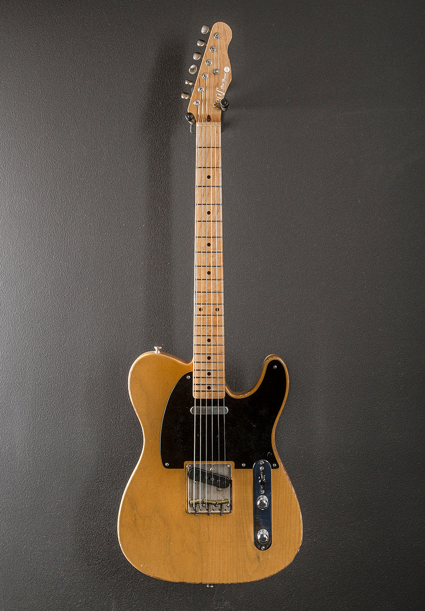 Blackguard Blonde, Handmade in Kansas City, Aged nitrocellulose lacquer finish, Swamp Ash body, Soft V shaped Maple neck with a 10" radius Maple fingerboard and Jescar 47095 frets, 25.5" scale length, 1 5/8th" nut width, Fountain City Guitarworks Broadcaster bridge and neck pickups, 3-way switching with the master volume and tone controls, Callaham string thru body vintage T bridge with the three compensated brass saddles, Gotoh SDS-510 tuners, The neck thickness is .92″ at the first and .98″ at the 12th frets, 7.8 pounds, With hardshell case