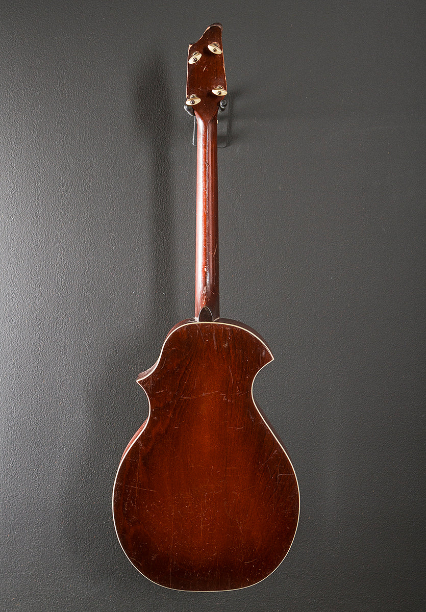 Sunburst, Made by Kay, Spruce top, Mahogany back and sides, V shaped Mahogany neck with a flat pearloid fingerboard and the original small frets, 23" scale length, 1 3/16th" nut width, Original pickguard/bridge and tuners, No case, Very good
