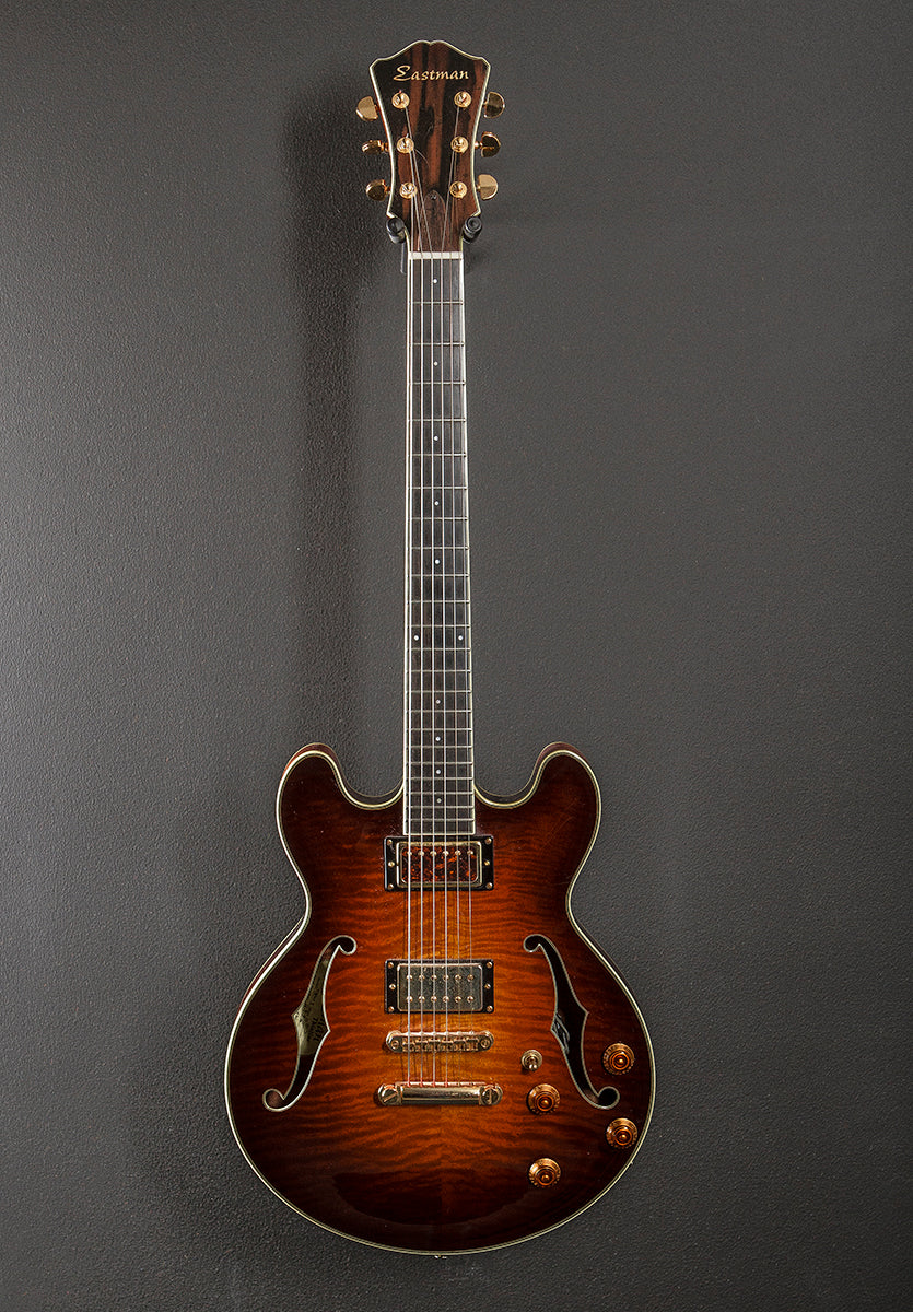 Sunburst, Gloss finish, 14" wide hollow body, Figured Maple top with the F holes, Hollow Mahogany body, Traditional even C shaped Mahogany neck with a bound 12” radius Ebony fingerboard and medium jumbo frets, 25” scale length, 1 3/4” nut width, Kent Armstrong HRG12ABE bridge and 2015 Lollar Imperial neck pickups, 3-way toggle switching with the volume and tone controls for each pickup, Gotoh tune-o-matic bridge and stop tailpiece, Gotoh cast/sealed tuners, The neck thickness is .82″ at the first and .90″ at the 12th frets, 6.2 pounds, With hardshell case, Very good