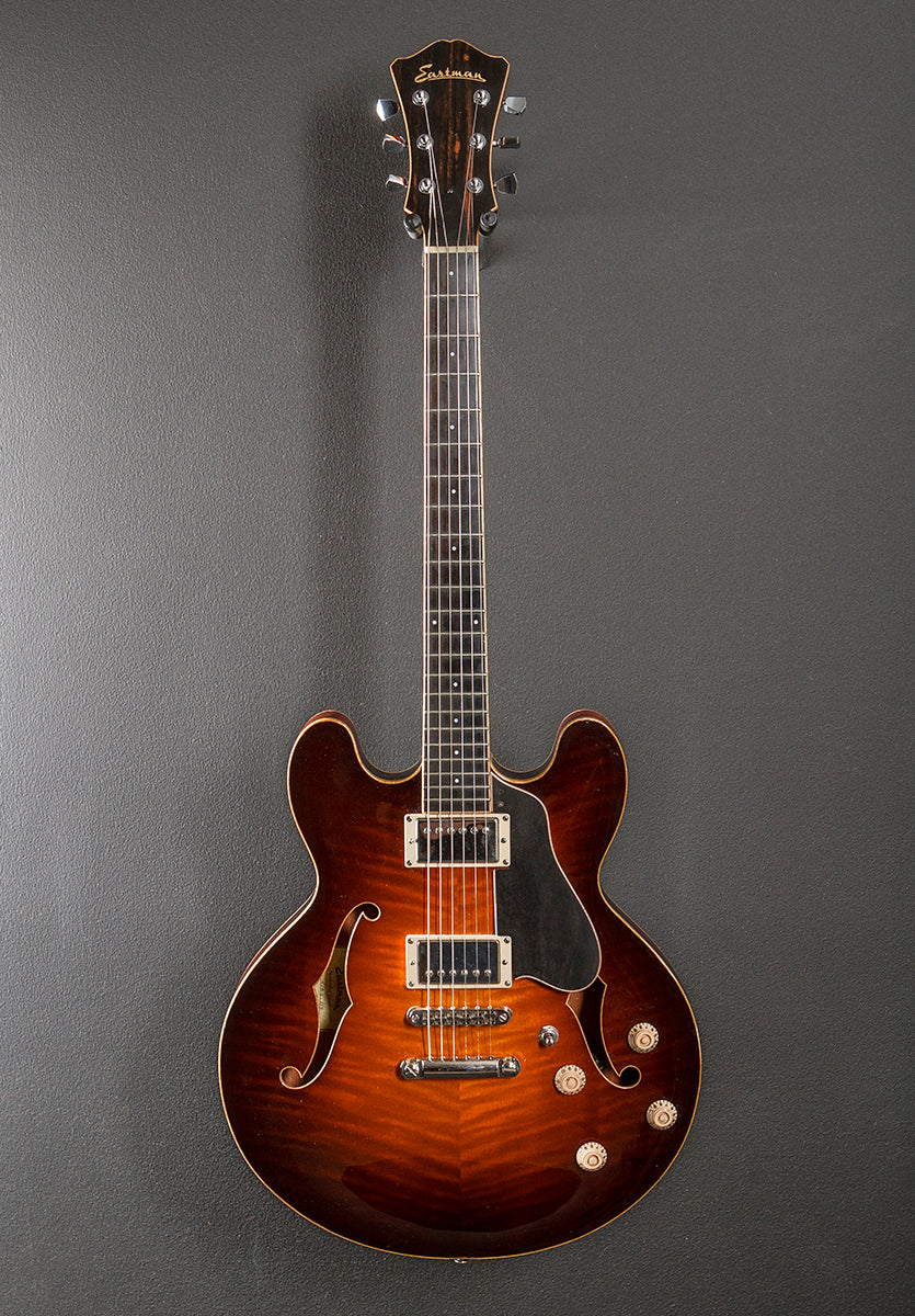 Sunburst, Serial number 4581, Gloss finish, Hollow body with a solid Maple top and solid Mahogany back/sides, Flame Maple binding, 12” radius Ebony fingerboard with the pearl dot inlays on a traditional even C shaped Mahogany neck, 25” scale length, 1 3/4” nut width, Newer Gibson Lead Pro bridge and Burstbucker #1 neck pickups were installed, 3-way toggle switching with the volume and tone controls for each pickup, Gotoh tune-o-matic bridge and stop tailpiece, Gotoh cast/sealed tuners, The neck thickness is .83″ at the first and .88″ at the 12th frets, 6.8 pounds, With hardshell case, Good