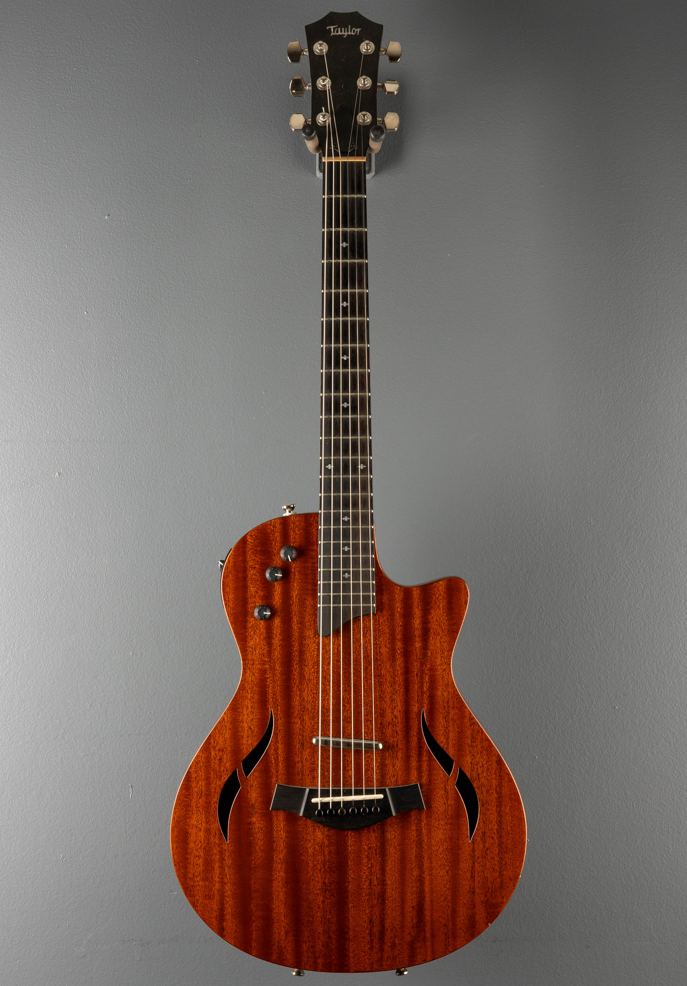 Very Good condition, Natural, Satin finish, T5z body shape, Tropical Mahogany top, Standard T5z bracing, Sapele back and sides, Standard C shaped Sapele neck, 12" radius Ebony fingerboard with the small diamond inlays and medium frets, 24 7/8th" scale length, 1 11/16th" nut width, Cast/sealed tuners, T5 electronics with the 5-way switching, The neck thickness is .84" at the first and .92" at the 9th frets, 5.0 pounds, With the Taylor gig bag.