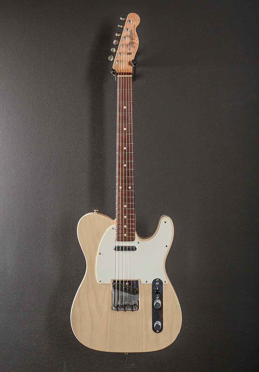 Vintage Blonde, Aged nitrocellulose lacquer finish, Ash body, 1960 oval C shaped Maple neck with a 9.5″ radius Rosewood fingerboard and medium jumbo frets, 25.5" scale length, 1 5/8th" nut width, Handwound '58 Relic Tele bridge and neck pickups, 3-way switching with the master volume and tone controls, String thru body Tele bridge with the three compensated steel saddles, Fender vintage style tuners, The neck thickness is .80″ at the first and .93″ at the 12th frets, 7.6 pounds, With the certificate and Fender hardshell case, Very good -ON HOLD TF TOW 02/20