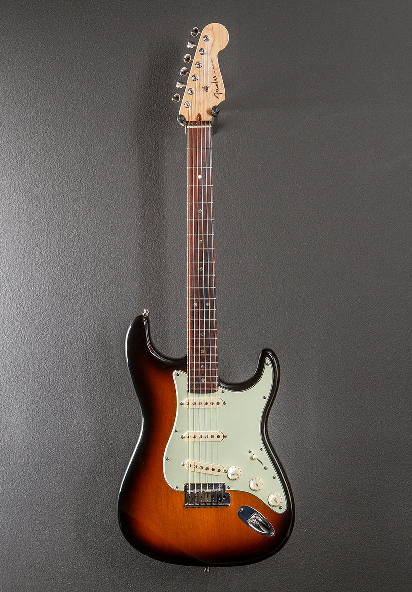 3 Color Sunburst, Gloss urethane body finish, Alder body, Modern C shaped Maple neck with a 9.5" radius Rosewood fingerboard and medium jumbo frets, 25.5" scale length, 1 11/16th" nut width, Repro pickguard, Onamac Windery Supreme Strat pickups have been installed, Rewired 5-way switching with the volume/tone/tone controls, Two point tremolo with the block steel saddles, Newer vintage style tuners have been installed, The neck thickness is .82″ at the first and .88″ at the 12th frets, 8.2 pounds, With the Fender hardshell case, Very good