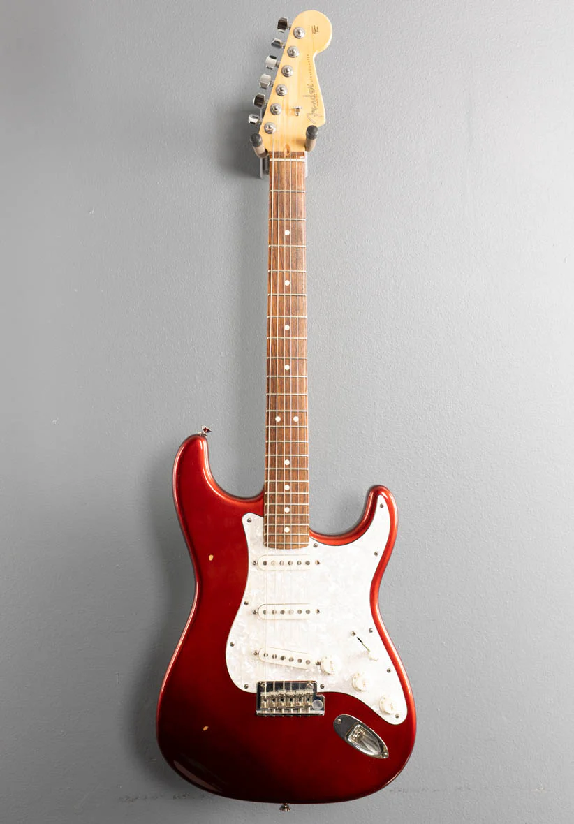 Very Good Condition, Candy Cola, Alder body, Modern C shaped Maple neck with a 9.5” radius Rosewood fingerboard and medium jumbo frets, 25.5″ scale length, 1.685” nut width, Fender Custom Shop Fat 50's single coil Strat Strat pickups with 5-way switching, Two point synchronized tremolo with the bent steel saddles, Deluxe staggered cast/sealed tuners, 7.8 pounds, With hardshell case.