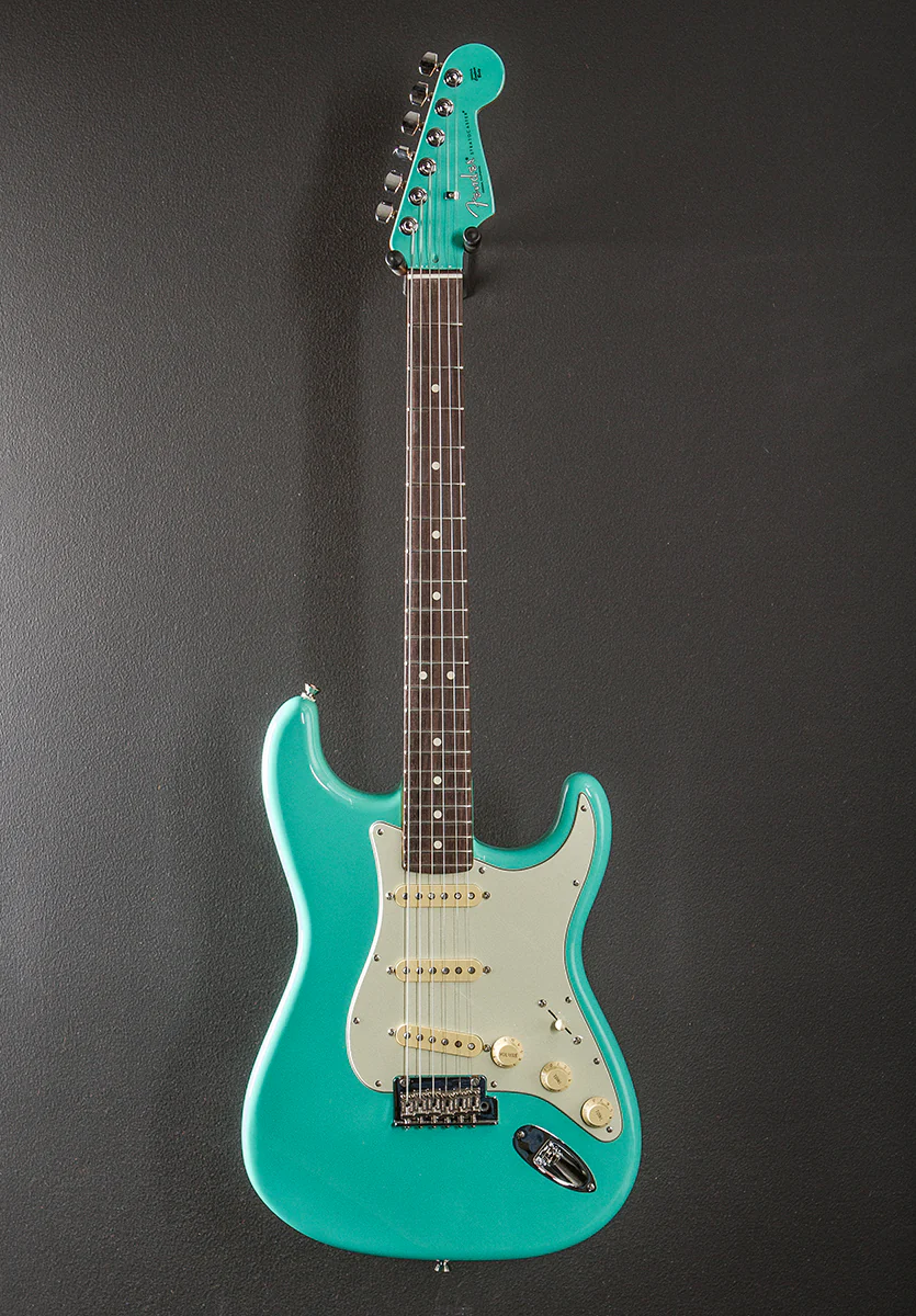 Seafoam Green with the matching headstock, Gloss urethane body finish, Alder body, Vintage style mint green pickguard, Deep C shaped Maple neck with a 9.5” radius Rosewood fingerboard and narrow tall frets, 25.5” scale length, 1 11/16th" nut width, Fender V-Mod II single coil Strat pickups, 5-way switching with the master volume, tone 1. (neck/middle pickups) and tone 2. (bridge pickup) controls, The push/push on the tone 2 control activates the neck pickup in switch positions one and two adding two unique pickup configurations not normally found on a Strat, Two point synchronized tremolo with the bent steel saddles, Standard staggered cast/sealed tuners, The neck thickness is .82″ at the first and .92″ at the 12th frets, 8.0 pounds, With the Fender hardshell case, Excellent